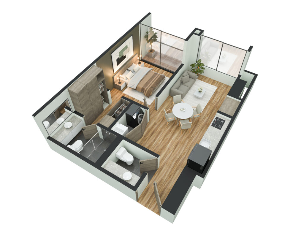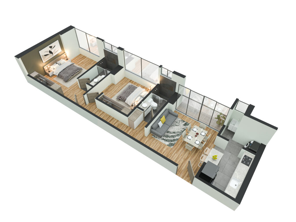 Nota: Las presentse ilustraciones es una representación artística; por lo tanto, el diseño, las medidas y las especificaciones del proyecto pueden diferir del resultado final. Los muebles y los elementos de decoración no están incluidos en el precio de venta, por lo tanto, no se entregan con el apartamento. Los planos e imágenes pueden sufrir modificaciones como consecuencia directa de las disposiciones administrativas contenidas en la licencia de construcción expedida por la autoridad competente.